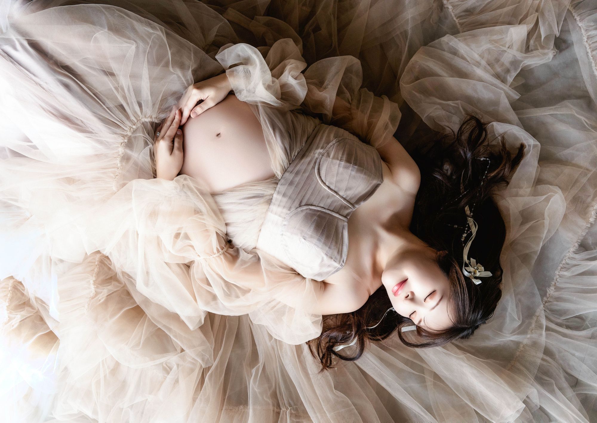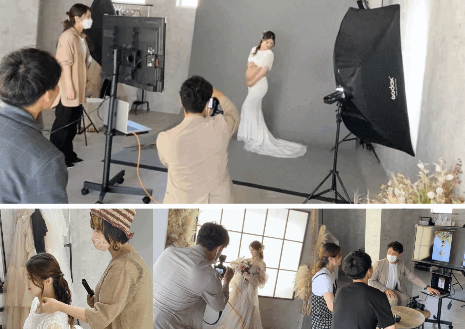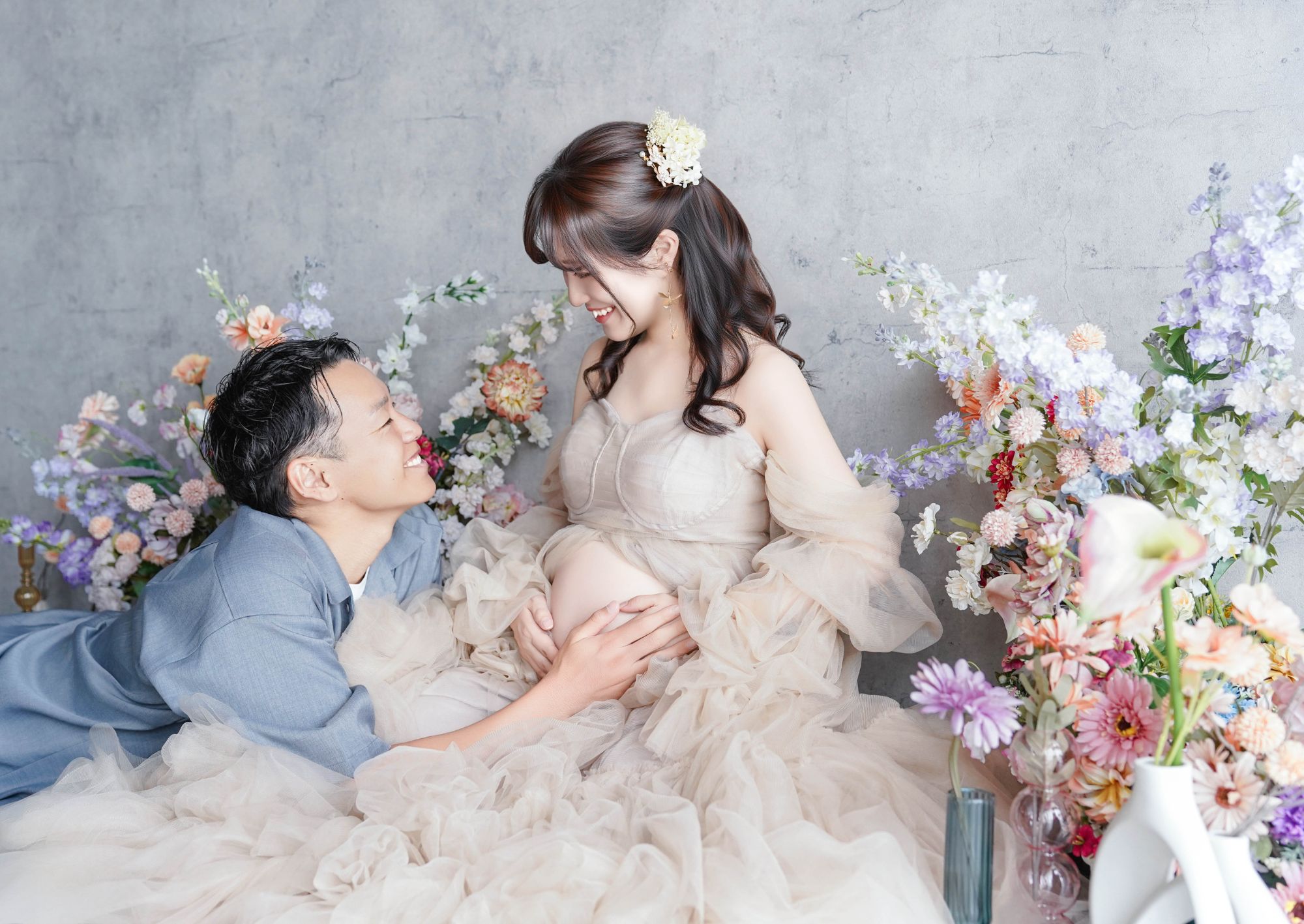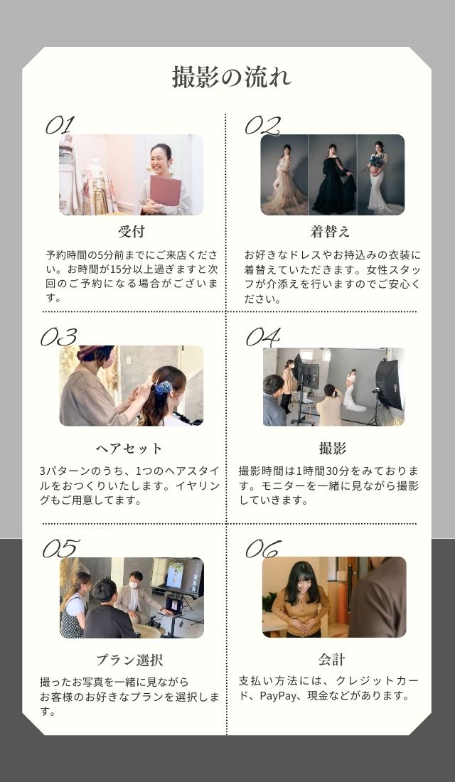 手の位置や足の位置は?初めての撮影では戸惑ったりしますよね。お客様がより美しく映るようにお腹の向き、顎の位置、手を添える位置などスタッフが適切に誘導して整えてまいります。