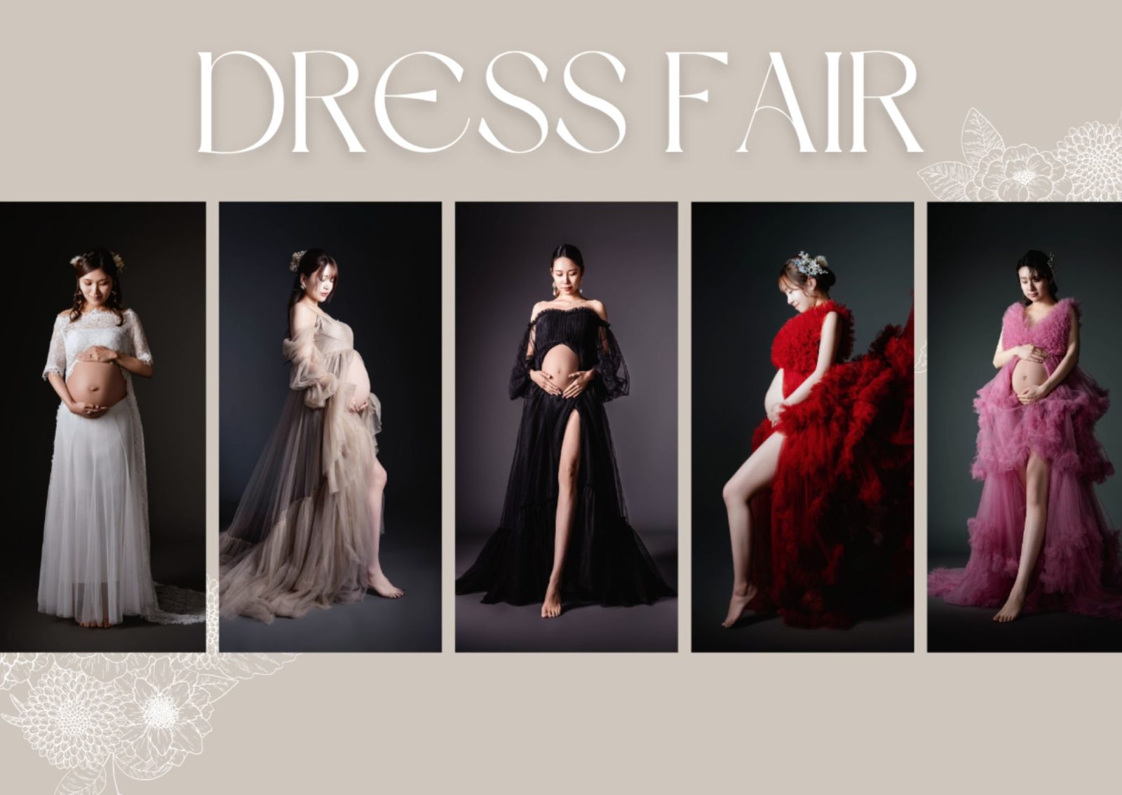 マタニティさんなら韓国ドレスやマタニティ用にウェディングドレスをご用意しております。